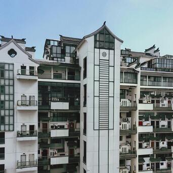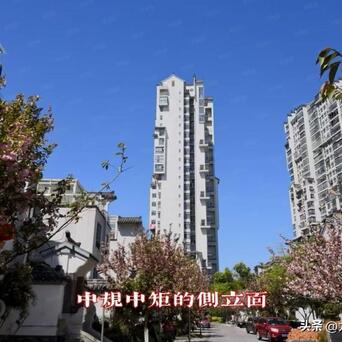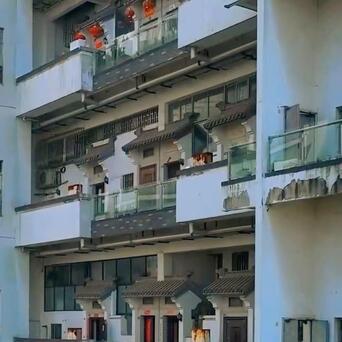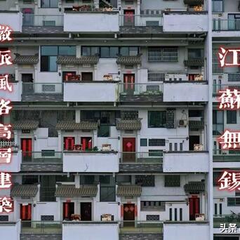 作为中国民间传统建筑风格之一的徽派建筑,以粉墙黛瓦马头墙为表型特征,以“三雕”为装饰特色,更以高宅、深井、大厅等为布局特点,静谧优美、如诗如画,地域特色鲜明。不过,作为民宅通常不过二层,尺度适中,构图和谐,类似下图中江苏无锡某市小区高层移植的徽派建筑细节处理手法,即便放眼全国也极为罕见。